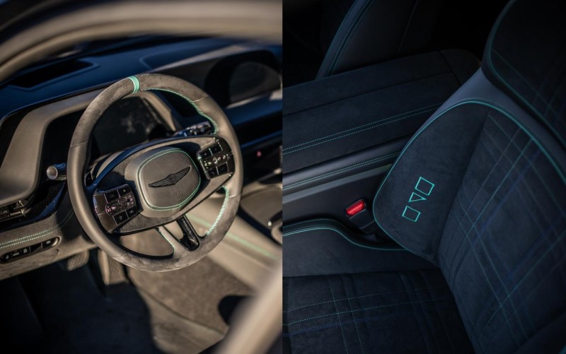 走进座舱,高性能的细节表达更显细腻,与豪华质感无缝相融。高级Chamude材质包裹的座椅与门板,以柔软立体的绗缝工艺营造出极致的豪华触感,而绿色Magma缝线则沿着绗缝线条悄然点缀,在精致的内饰氛围中,悄悄勾勒出高性能的轮廓;运动型座椅上的Magma刺绣,小巧却醒目,成为座舱中高性能身份的点睛之笔,无需大面积的性能标识,便让高性能属性清晰可感;方向盘、中控台的设计延续了捷尼赛思的简约优雅,性能相关的设计细节隐于其中,让驾驶者在沉浸豪华体验的同时,随时能感受到背后的性能支撑。